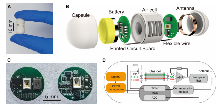 基于非分光红外传感的摄入式气体检测胶囊,实现了胃肠道内二氧化碳与甲烷的原位、实时检测。