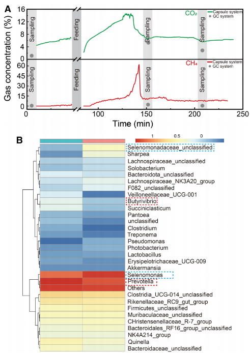 成功在动物模型中捕获到了消化过程中从二氧化碳积累到甲烷生成的动态代谢转变,气体变化的趋势与微生物群落活动高度吻合。