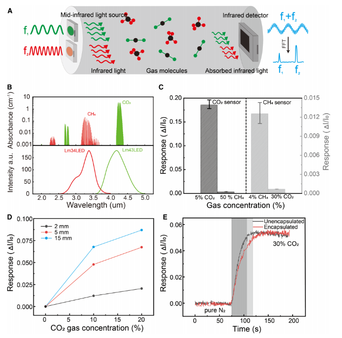 胃肠道微生物群产生的气体代谢物是反映消化过程与肠道健康的重要标志物,对其进行动态、精准的检测对于理解肠道代谢机制及诊断相关疾病具有重要意义。传统检测方法存在明显局限:临床呼气试验受气体稀释效应影响,准确性欠佳且无法定位气体来源;侵入性检测手段易引发不适。针对这一挑战,本研究设计了一种基于频分复用技术的非分光红外(NDIR)气体传感胶囊,实现了胃肠道内二氧化碳(CO₂)和甲烷(CH₄)的实时原位监测。该器件有望为肠道微生物生态学研究提供强有力的工具。