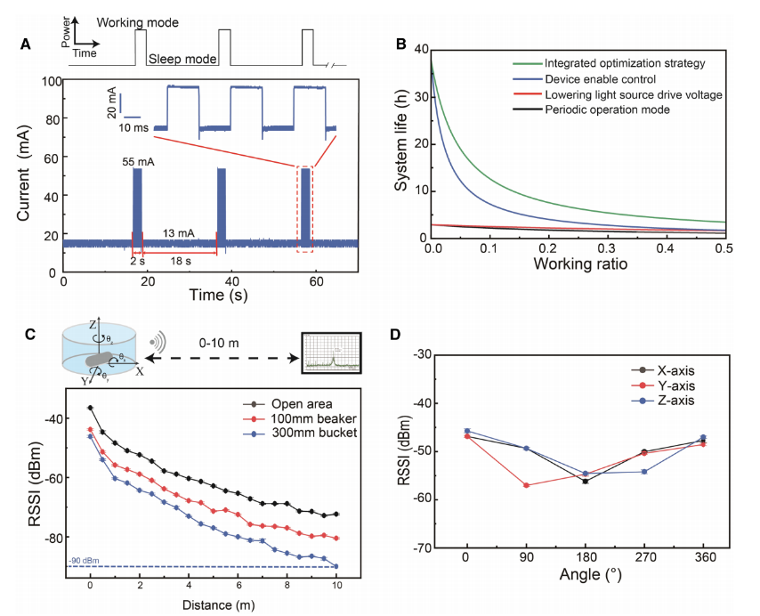 为确保在体监测的实用性,团队对胶囊系统的功耗与通信性能进行了针对性优化(图4)。系统采用间歇工作模式,通过调整光源驱动电压并优化采样策略,在保障数据质量的同时大幅降低能耗,可支持约24小时的连续监测,满足完整消化道监测周期需求。无线通信采用315MHz频段,经阻抗匹配优化后,峰值工作电流仅4mA。在模拟环境中,信号接收强度(RSSI)稳定,即使胶囊旋转或改变距离,信号仍能有效传输,实测RSSI值均高于接收器灵敏度阈值,确保体内数据实时可靠传输。